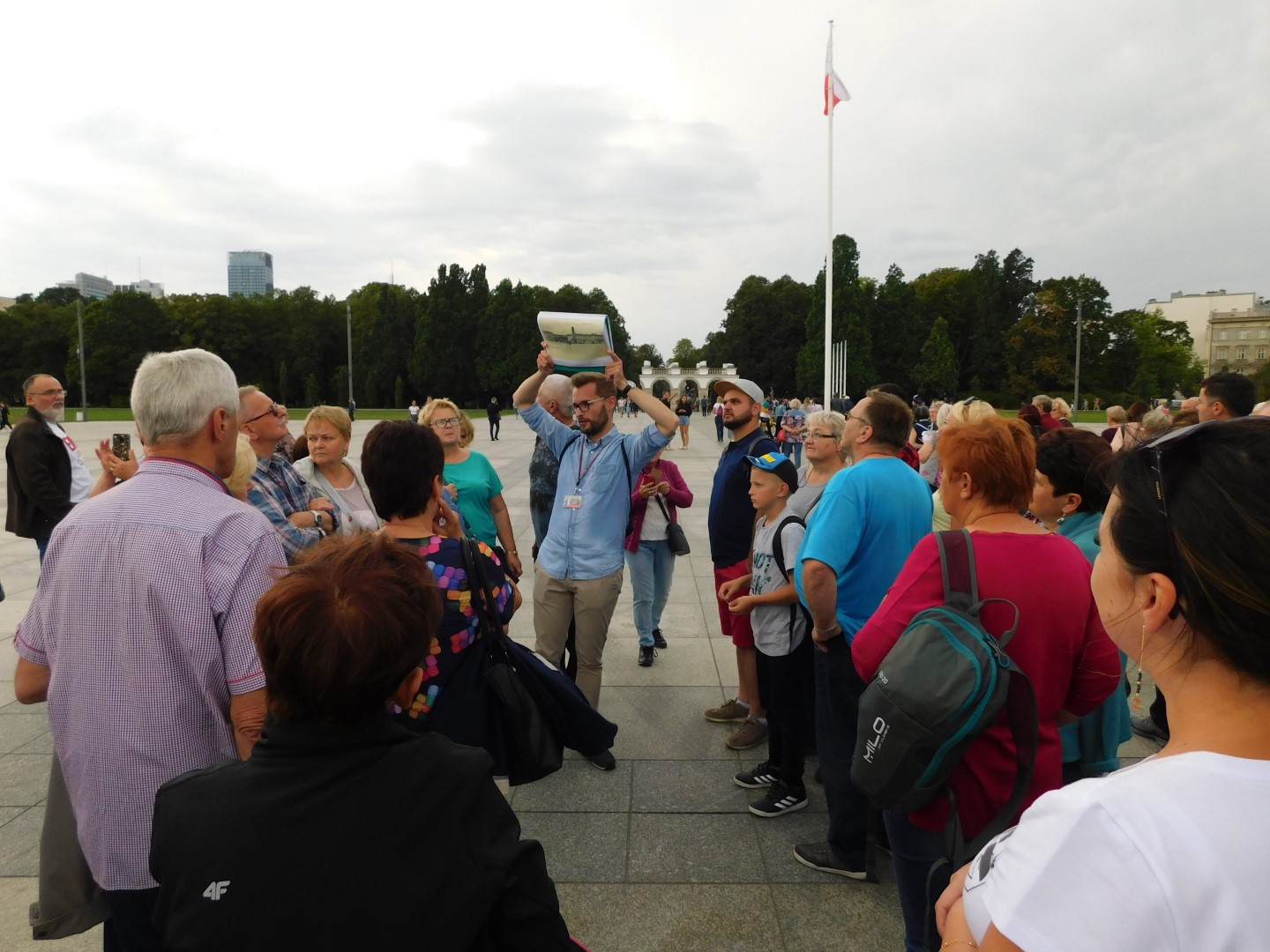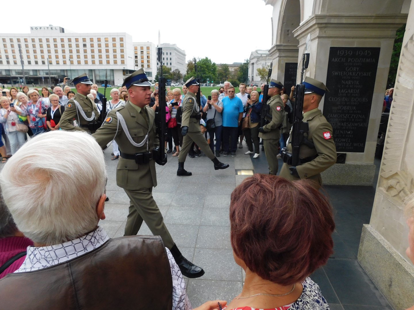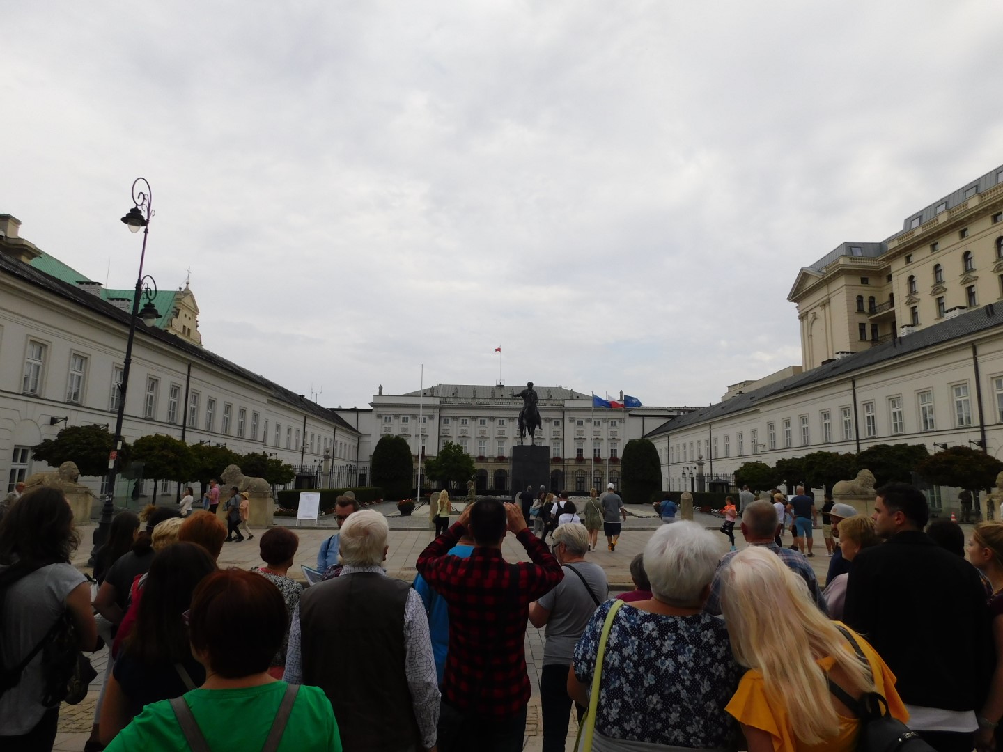 Idąc Krakowskim Przedmieściem dotarliśmy do okazałej zabytkowej budowli - Pałacu Prezydenckiego, następnie na Plac Piłsudskiego z Grobem Nieznanego żołnierza, gdzie mogliśmy obejrzeć zmianę warty.