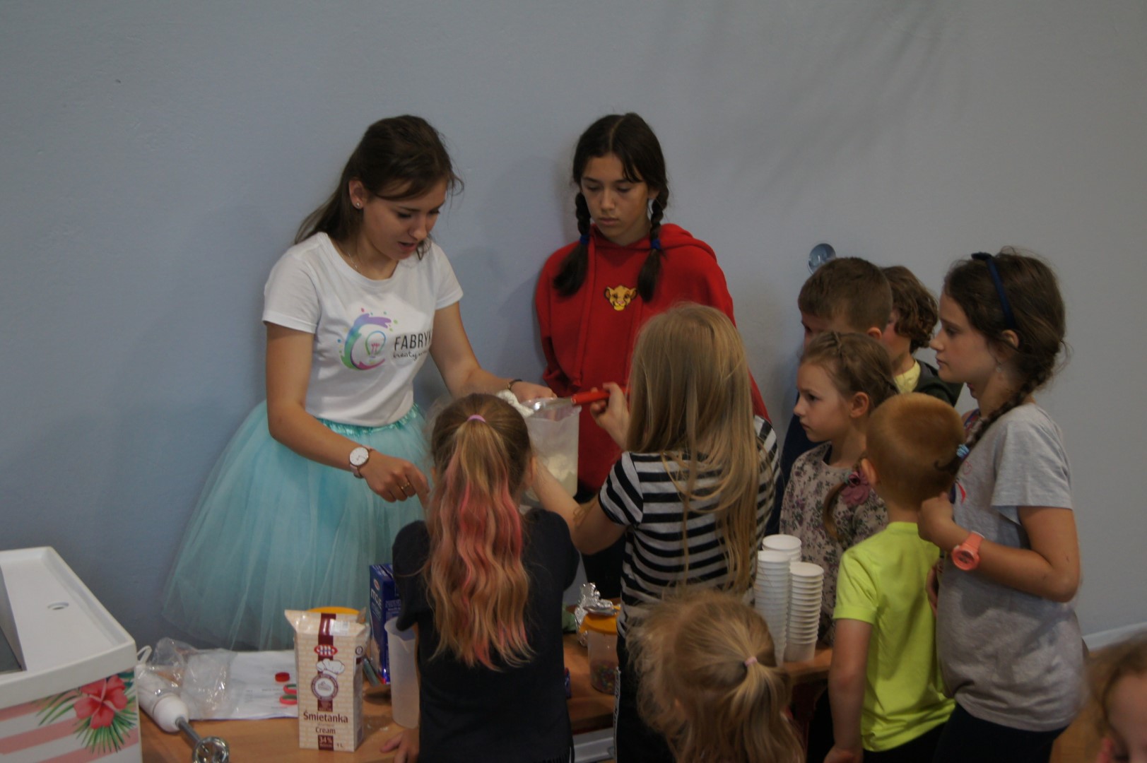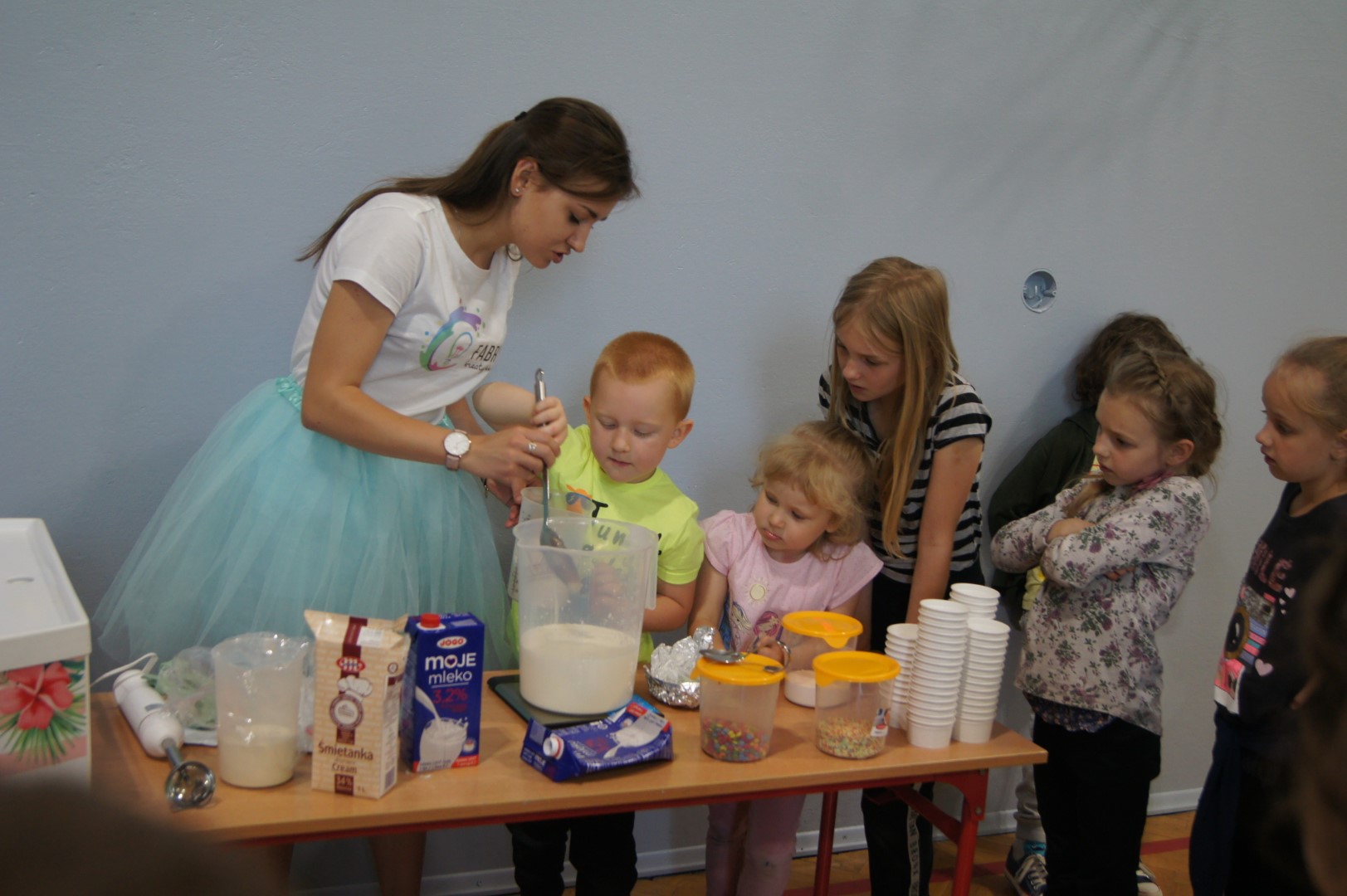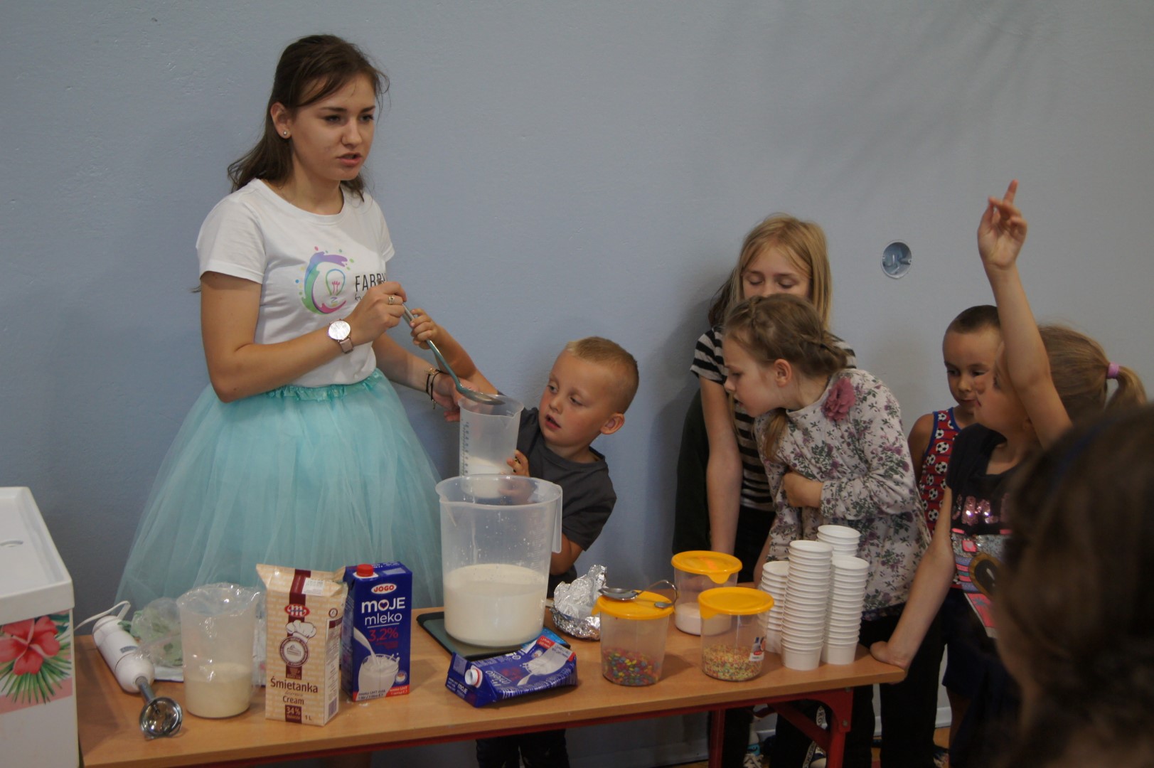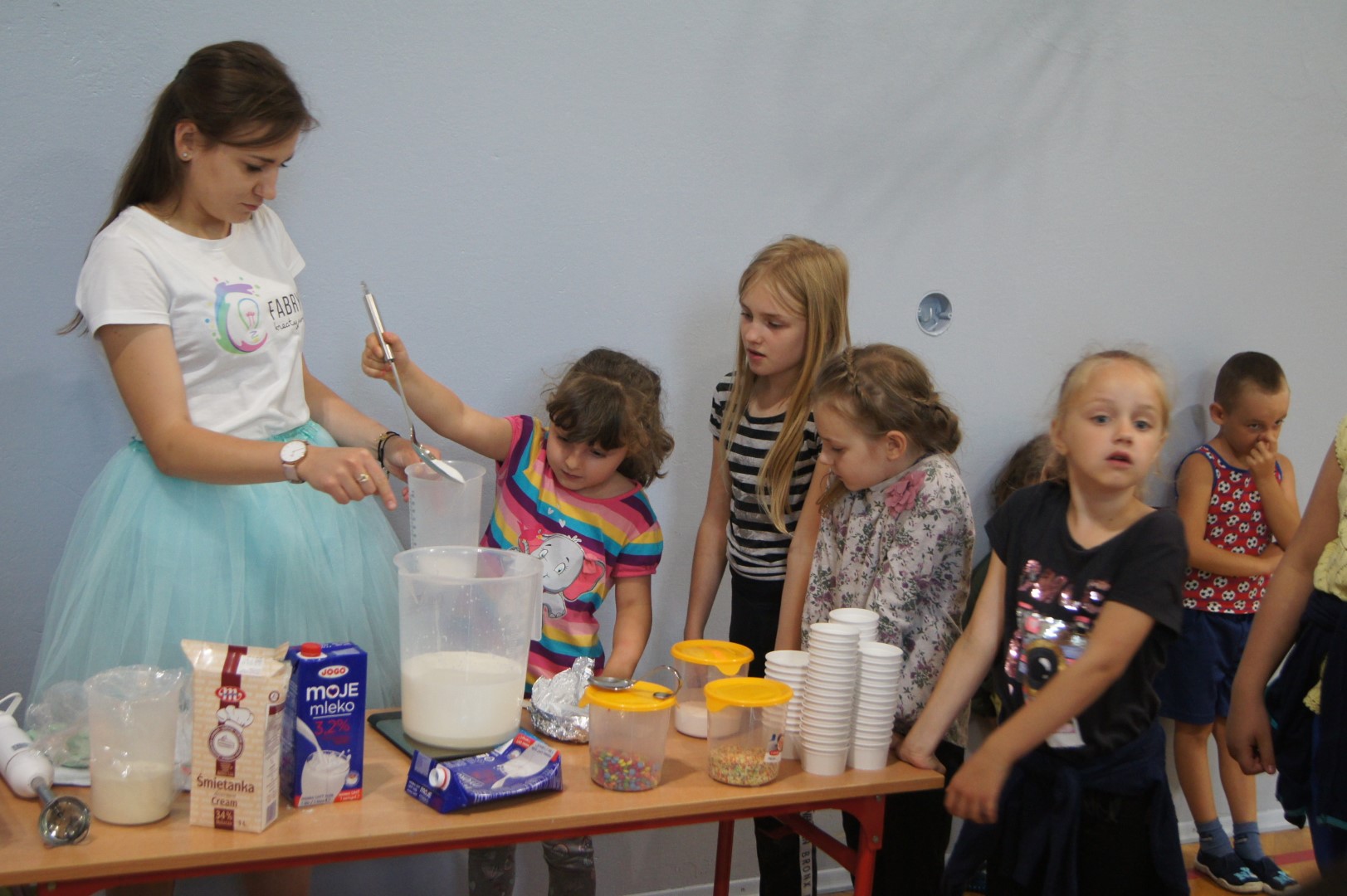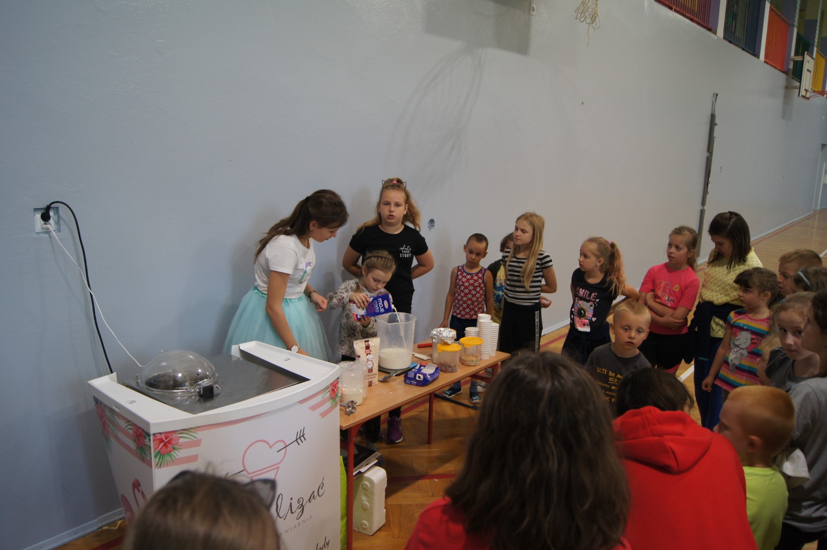 - 17.07.2020 - Gry i zabawy ruchowe dla dzieci w Hali sportowej ZSP w Tarnowcu połączone z warsztatmi tworzenia lodów.