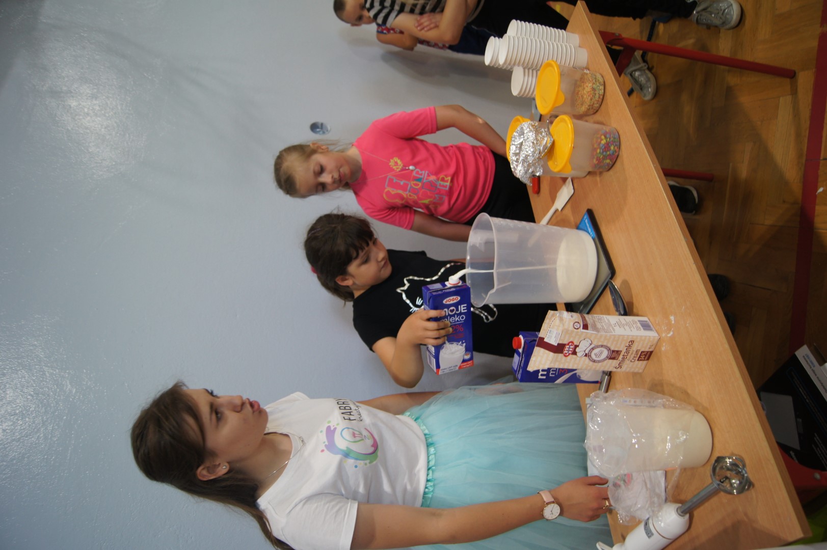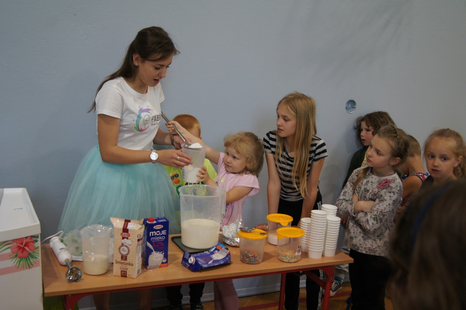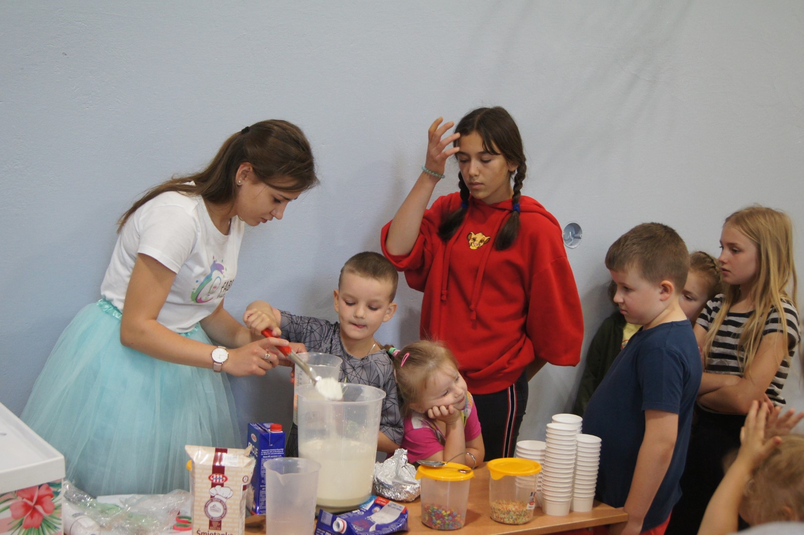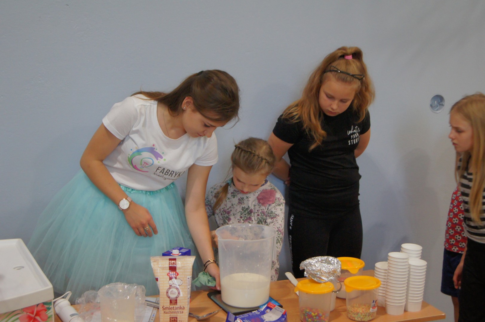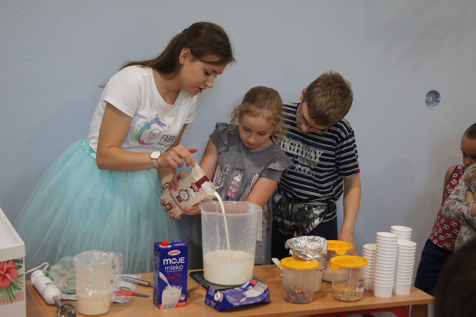 - 17.07.2020 - Gry i zabawy ruchowe dla dzieci w Hali sportowej ZSP w Tarnowcu połączone z warsztatmi tworzenia lodów.