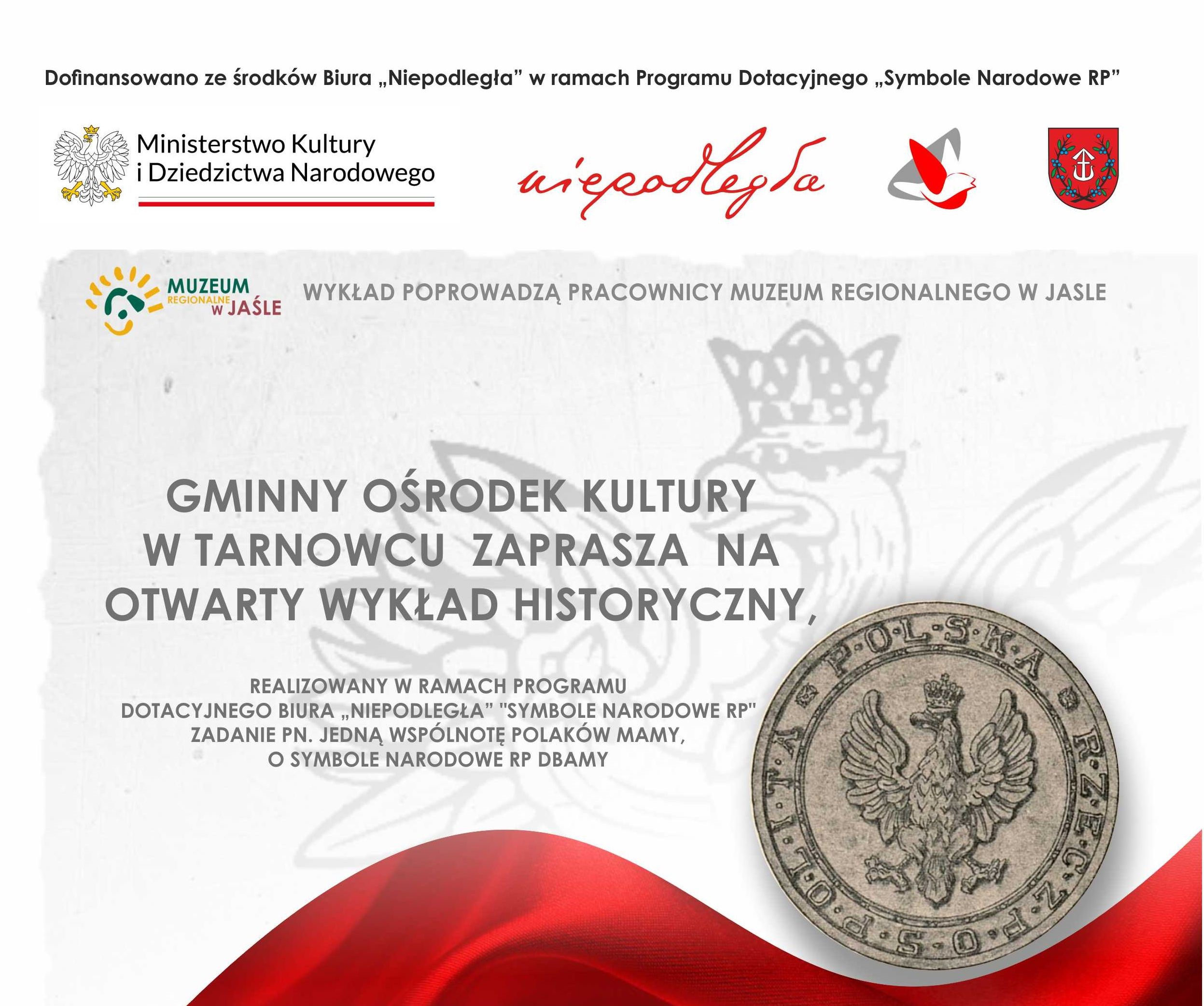 Gminny Ośrodek Kultury w Tarnowcu zaprasza na Otwarty Wykład Historyczny- Symbole Narodowe RP Realizowany w ramach programu Dotacyjnego Biura „Niepodległa” "Symbole Narodowe RP" Zadanie pn. Jedną wspólnotę Polaków mamy, o Symbole Narodowe RP dbamy. Wykład poprowadzą pracownicy Muzeum Regionalne w Jaśle. 30 maja 2023 r. godz 18:00 - sala Gminnego Ośrodka Kultury w Tarnowcu