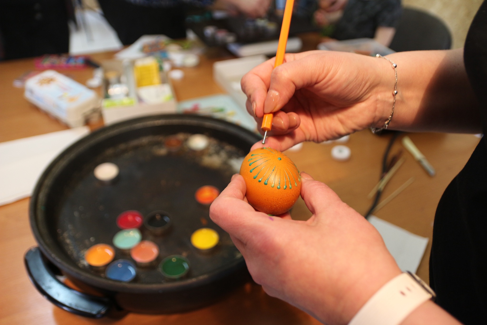 We środę, 5 kwietnia, w Gminnym Ośrodku Kultury odbyło się wspólne malowanie pisanek. Pod okiem Prowadzących, uczestnicy krok po kroku zapoznali się z techniką polegającą na malowaniu jajek gorącym woskiem i nakładaniu kolorów poprzez kąpiele barwiące. Technika ta jest najstarszą, tradycyjną techniką ozdabiania pisanek wielkanocnych - wielobarwne, starannie ozdobione pisanki będą pięknym tradycyjnym elementem w koszyku wielkanocnym. Paniom Katarzynie Kani i Katarzynie Piskorz serdecznie dziękujemy za przeprowadzenie Warsztatów, uczestnikom zaś za twórczy w nich udział - Życzymy Wesołych Świąt Wielkanocnych !