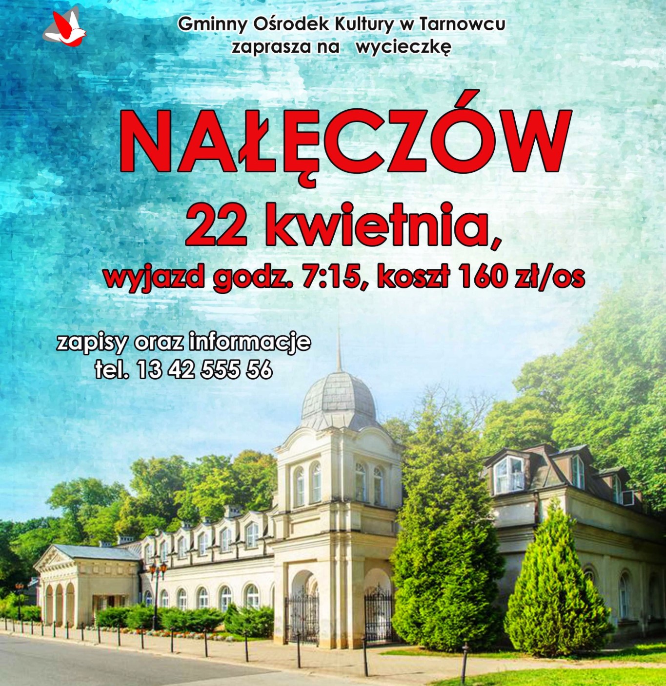 Gminny Ośrodek Kultury w Tarnowcu zaprasza na wycieczkę do klimatycznego Nałęczowa - miasta wpisanego do rejestru zabytków województwa lubelskiego, jako zespół architektoniczno-krajobrazowy! Sobota, 22.04.2023.
