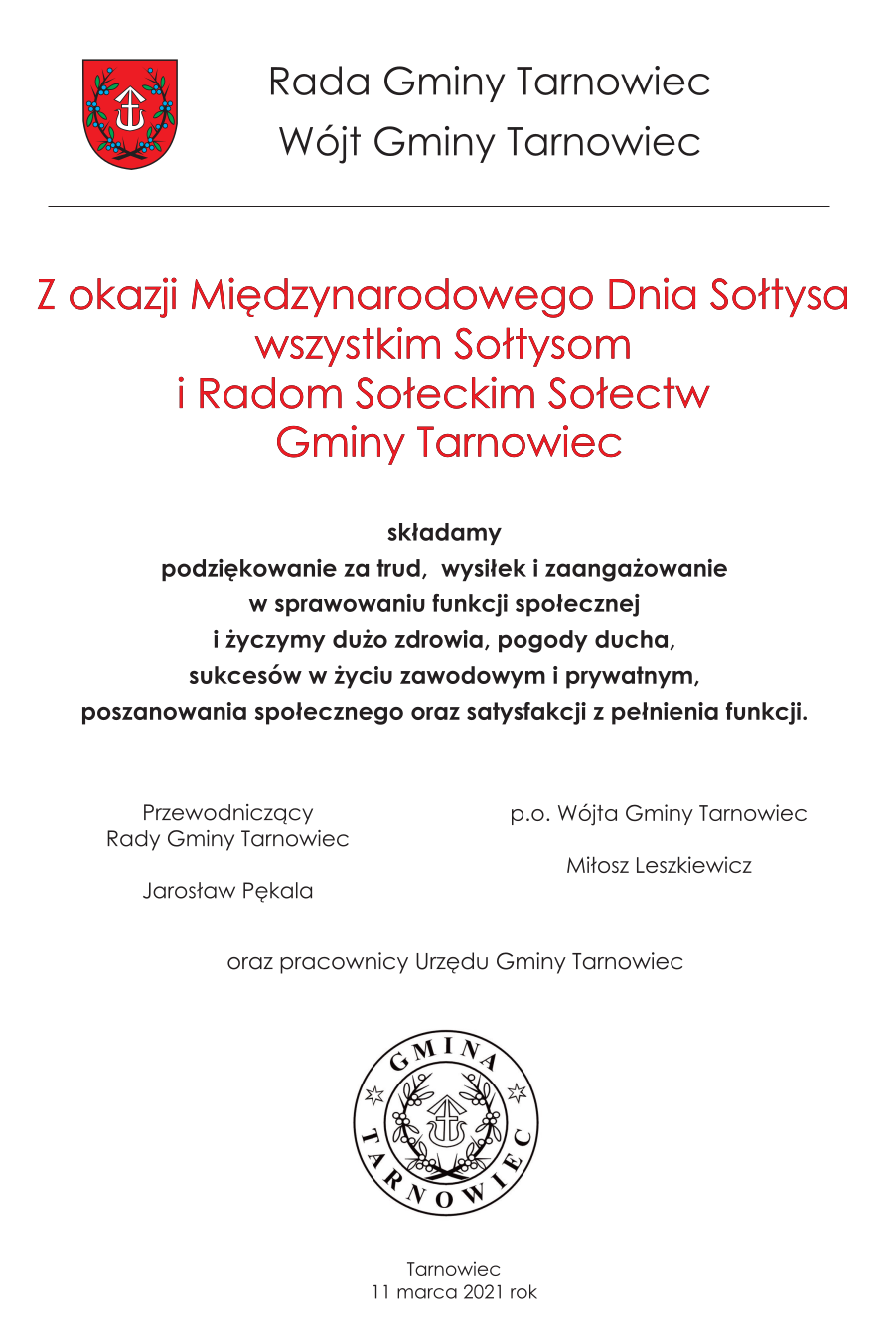 Z okazji Międzynarodowego Dnia Sołtysa wszystkim Sołtysom i Radom Sołeckim Sołectw Gminy Tarnowiec składamy podziękowanie za trud, wysiłek i zaangażowanie w sprawowaniu funkcji społecznej i życzymy dużo zdrowia, pogody ducha, sukcesów w życiu zawodowym i prywatnym, poszanowania społecznego oraz satysfakcji z pełnienia funkcji.